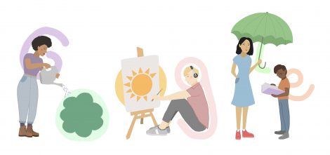 On the left, a woman can be seen watering a plant showing kindness to the earth. In the center a boy can be seen painting, highlighting kindness to oneself. And on the right, a woman can be seen holding an umbrella for a boy as an example of kindness to others.