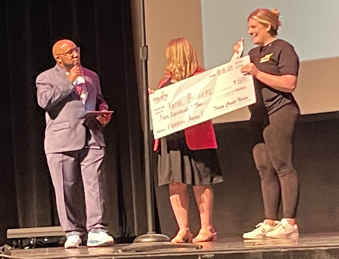 Billy Mills Middle School math teacher Katie Biggers, right, wins a Horizon Award during the Lawrence school district’s back-to-school kickoff event Tuesday, Aug. 15, 2023, at the Lied Center. Biggers received a $500 check from Truity Credit Union. Superintendent Anthony Lewis is at left, and Audra Fussell, Truity business development officer, is at center.