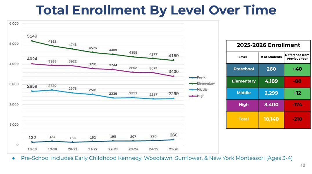 That’s what school board members heard at their meeting on Monday, when district staff presented a review of enrollment and elementary class sizes for the 2025-2026 school year. According to the presentation, the district’s enrollment was 10,148 students, with 9,337 enrolled in in-person K-12 classes, 260 preschool students and 551 students in the Lawrence Virtual School.