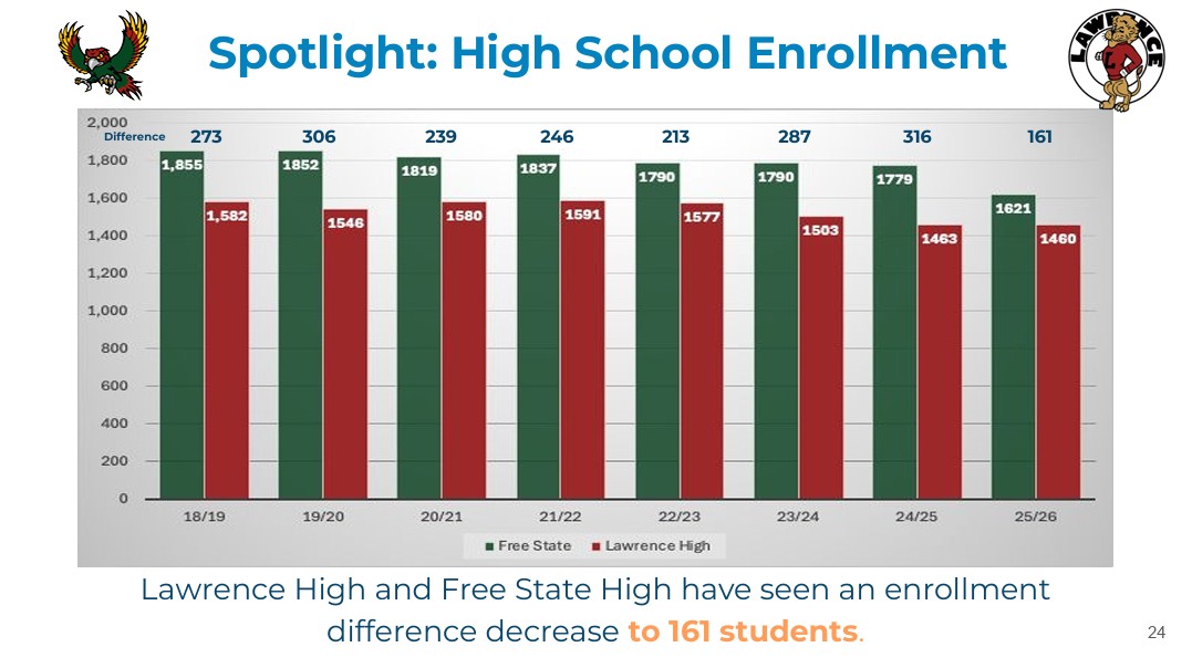 In 2025-2026, Free State has 1,621 students and Lawrence High has 1,460, a difference of 161 students. The previous school year, Free State enrolled 1,779 students compared to LHS’ 1,463, a 316-student gap.