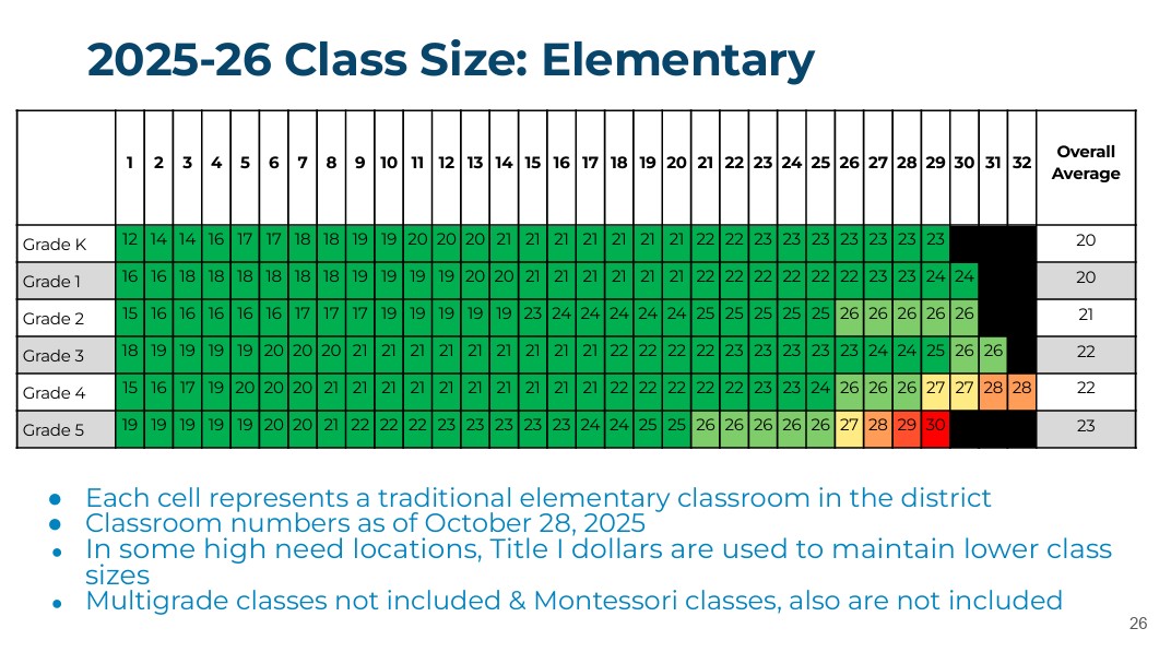 This is the first of two presentations that will discuss class sizes in the district, Swift said. The second presentation outlining middle and high school class sizes is scheduled for a board meeting on Dec. 8.