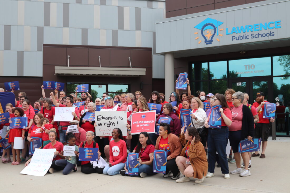 People gathere outside the Lawrence school district offices on Monday, Sept. 8, 2025 to advocate for education support professionals.