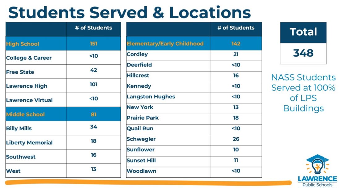 In a presentation by David Farve, NASS’ coordinator, the board heard that American Indian and Alaska Native students make up around 8% of the Lawrence school district’s total enrollment, and NASS serves around 350 students who represent more than 70 tribal affiliations. The school with the most NASS students – more than 100 – is Lawrence High School. The number of students who self-identify as American Indian or Alaska Native is larger than the number served by NASS, at around 810 students.