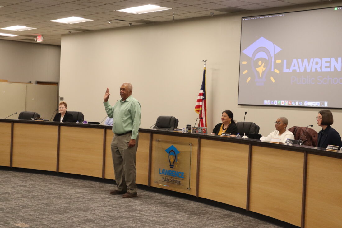 The winners of the 2025 general election for Lawrence school board were sworn in at the board’s meeting on Monday, as was the fourth-place finisher who was chosen to fill a vacant seat.