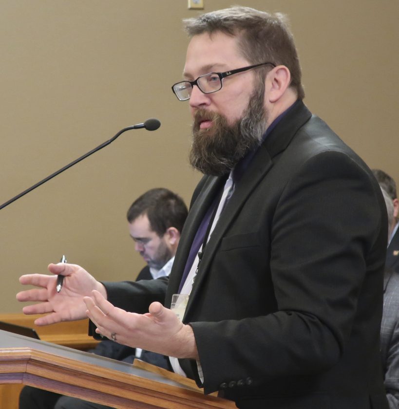 In this Feb. 12, 2019 photo, Bryan Caskey, elections director for the Kansas secretary of state’s office, testifies before the Kansas House Elections Committee at the Statehouse in Topeka, Kansas. (AP Photo/John Hanna)