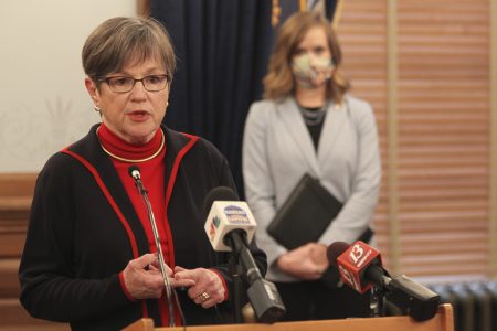 Kansas Gov. Laura Kelly speaks during a news conference, Tuesday, Feb. 9, 2021, at the Statehouse in Topeka.