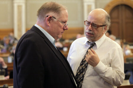 Kansas House Minority Leader Dan Hawkins, left, R-Wichita, confers with Minority Leader Tom Sawyer, D-Wichita, during a session at the Statehouse in Topeka on Friday, April 1, 2022.