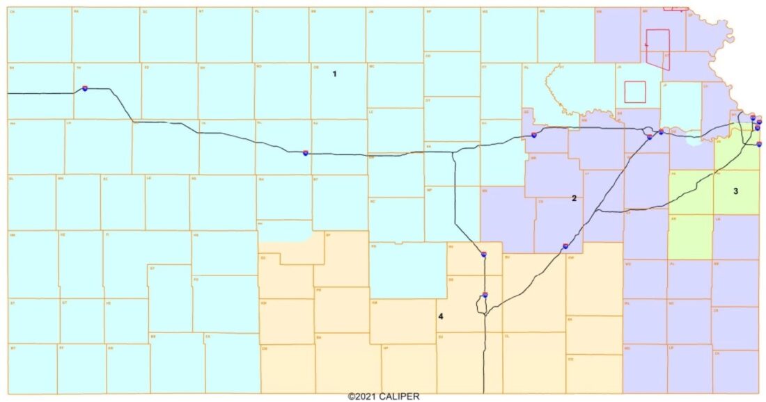 This screenshot from a Kansas Legislative Research Department document shows the current congressional map, which is a product of redistricting in 2022.