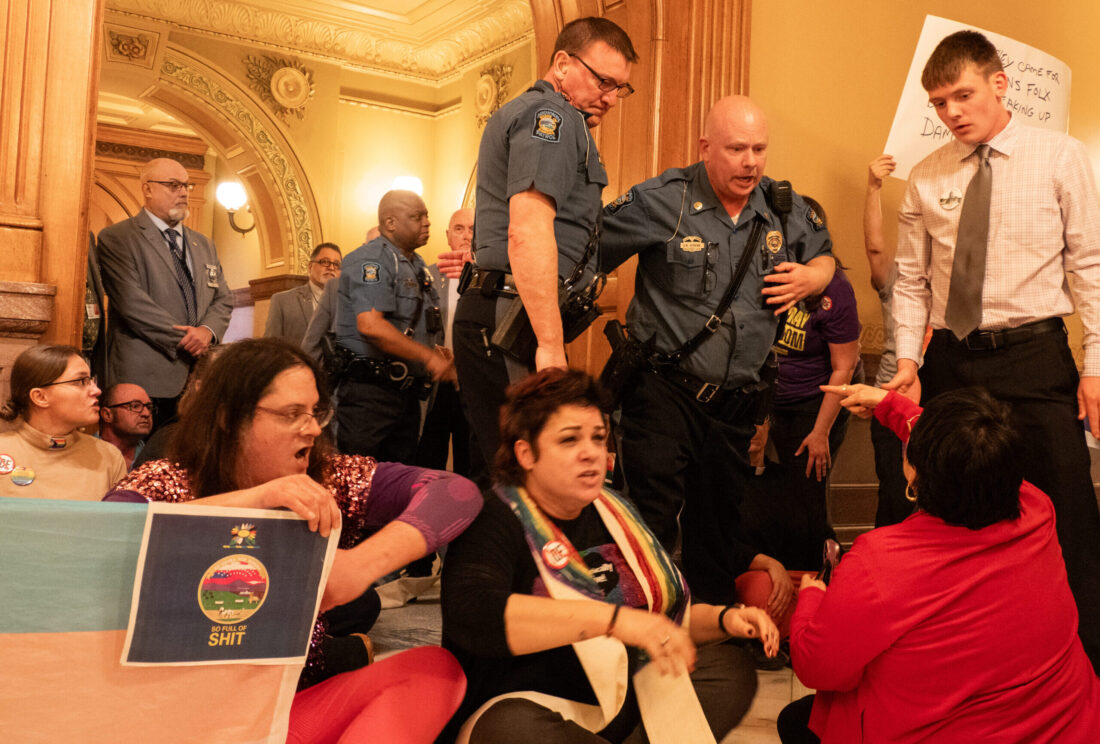 As troopers hoisted activists up from their seats, encouraging them to disperse, the group sang in harmony: “No one is getting left behind this time. No one is getting left behind. No one is getting left behind this time. We get there together or never get there at all.”