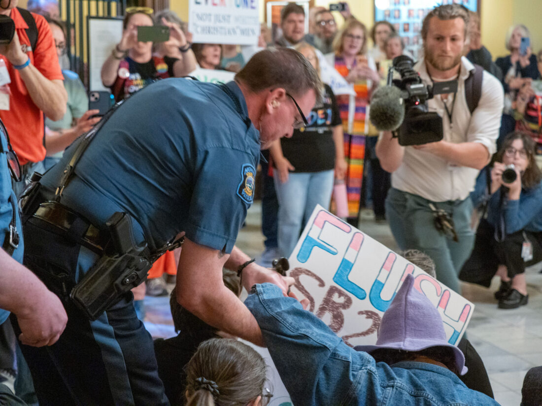 Clergy members led a sit-in protest Tuesday in opposition to a recently passed anti-trans law. The Republican-controlled Legislature used tactics to avoid public input and overrode the governor’s veto to pass Senate Bill 244, requiring people in public buildings to use the bathroom that coincides with their biological sex and also mandating driver’s licenses include a person’s biological sex instead of their gender.
