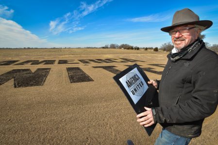 Stan Herd, known for elaborate portraits and other designs cut into fields, has crafted a message of unity for Wednesday’s celebration. He and his team carefully charred the phrase, “America United” in a former hay field outside Lawrence.