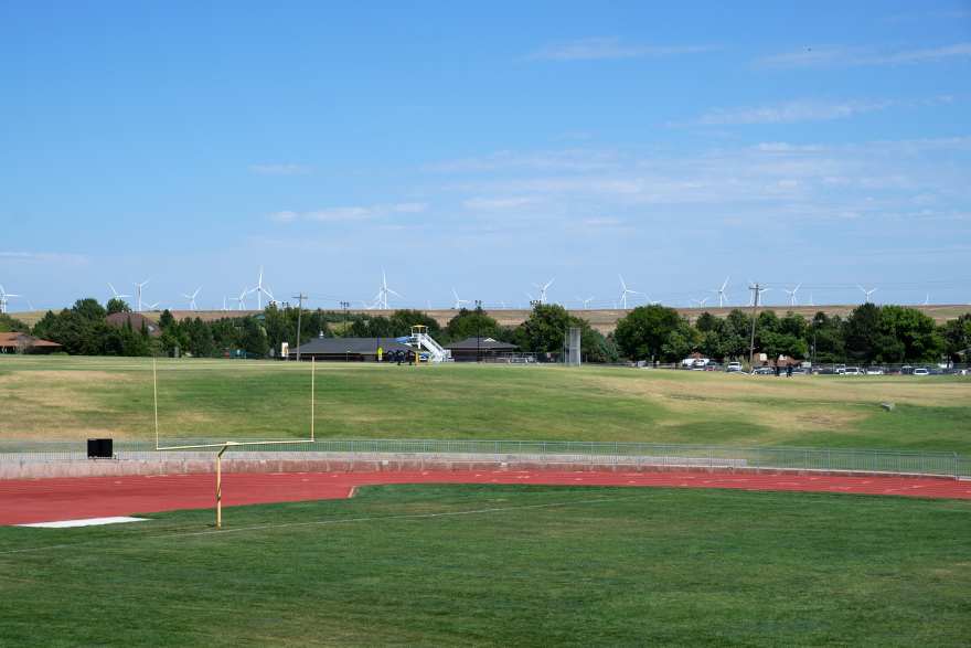 Standing at the top of the bleachers, you can see the wind farm that helped pay for them.