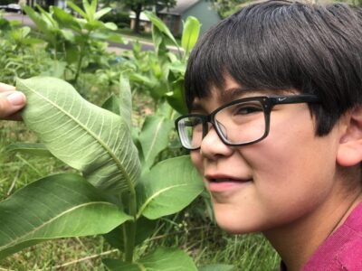Oliver Hernandez poses with a common milkweed plant in his front yard in 2020. A tiny, young monarch caterpillar and even tinier monarch eggs are visible on the underside of a leaf.