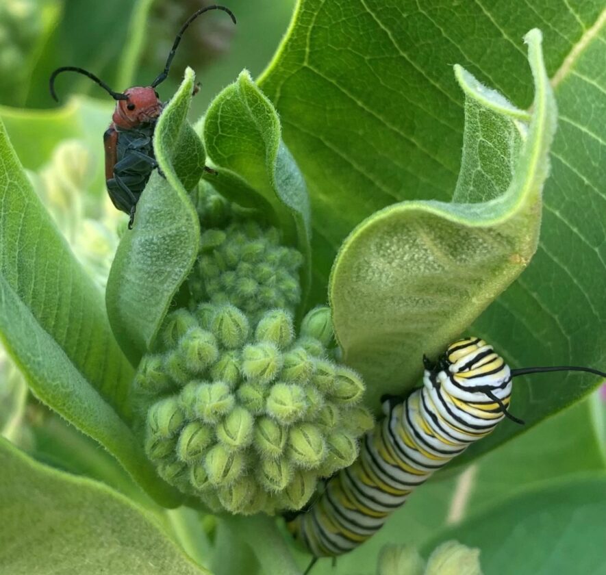 A monarch caterpillar and a milkweed beetle munch on common milkweed in Ginger Werp’s garden in Overland Park last summer.