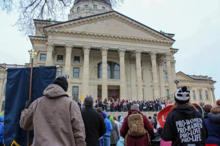 Crisis pregnancy center operators spoke to anti-abortion protestors in January at the annual Kansas March for Life in Topeka.