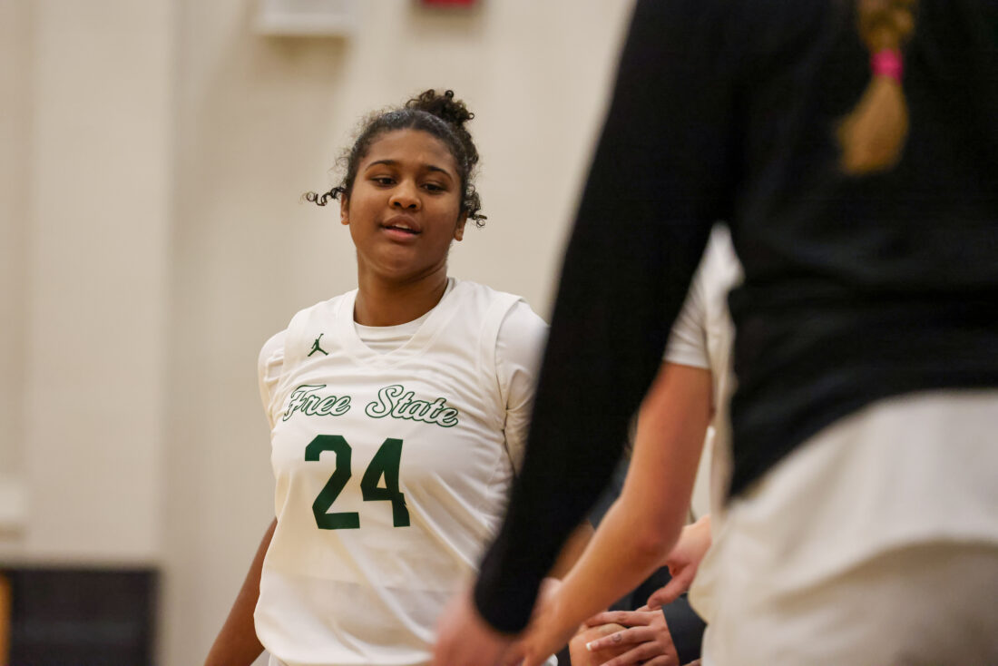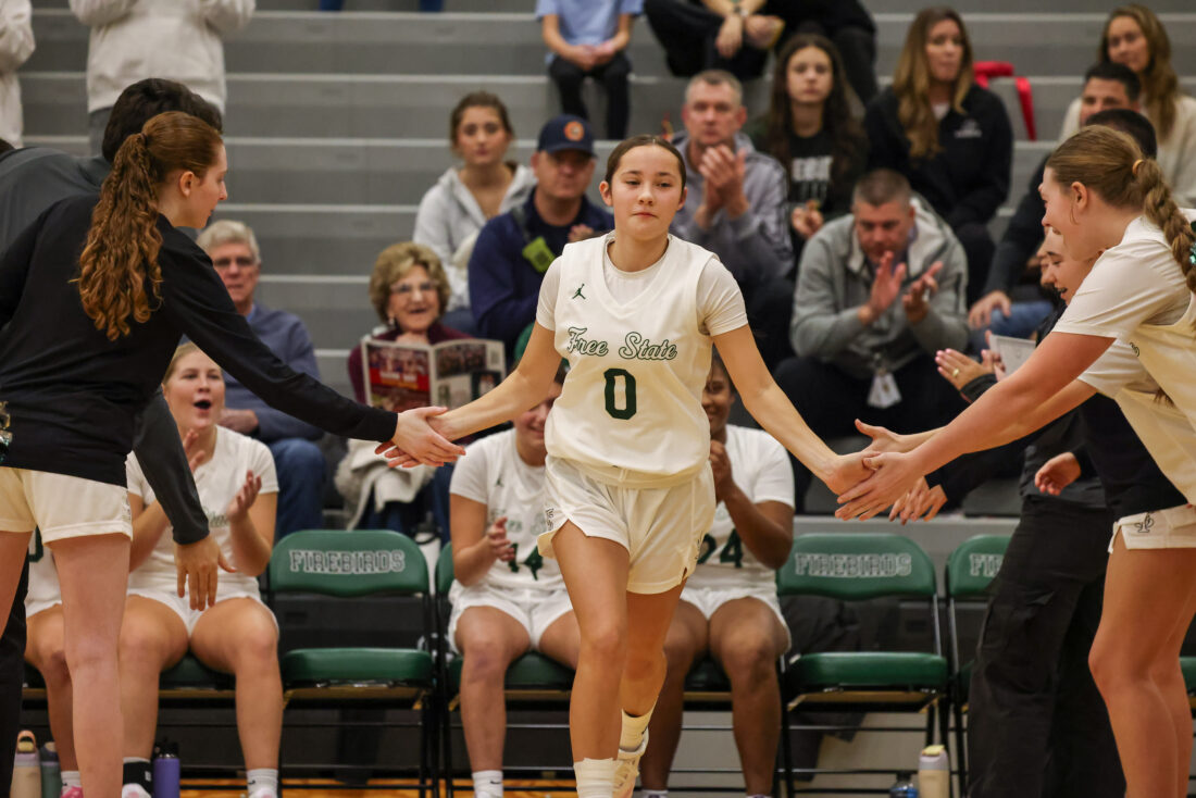 Free State senior Addie Fulscher comes off the bench as she is introduced before the Firebirds’ game against Junction City on Tuesday, Dec. 2, 2025, at Free State High School in Lawrence.