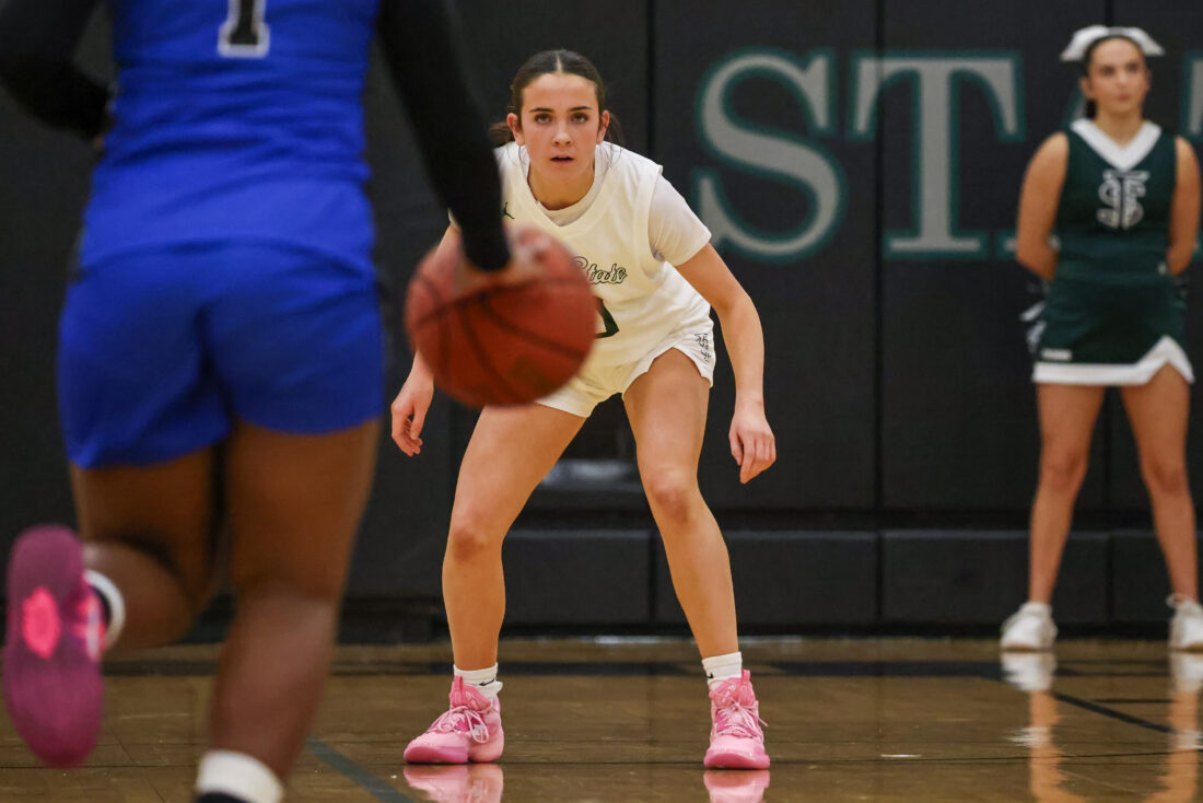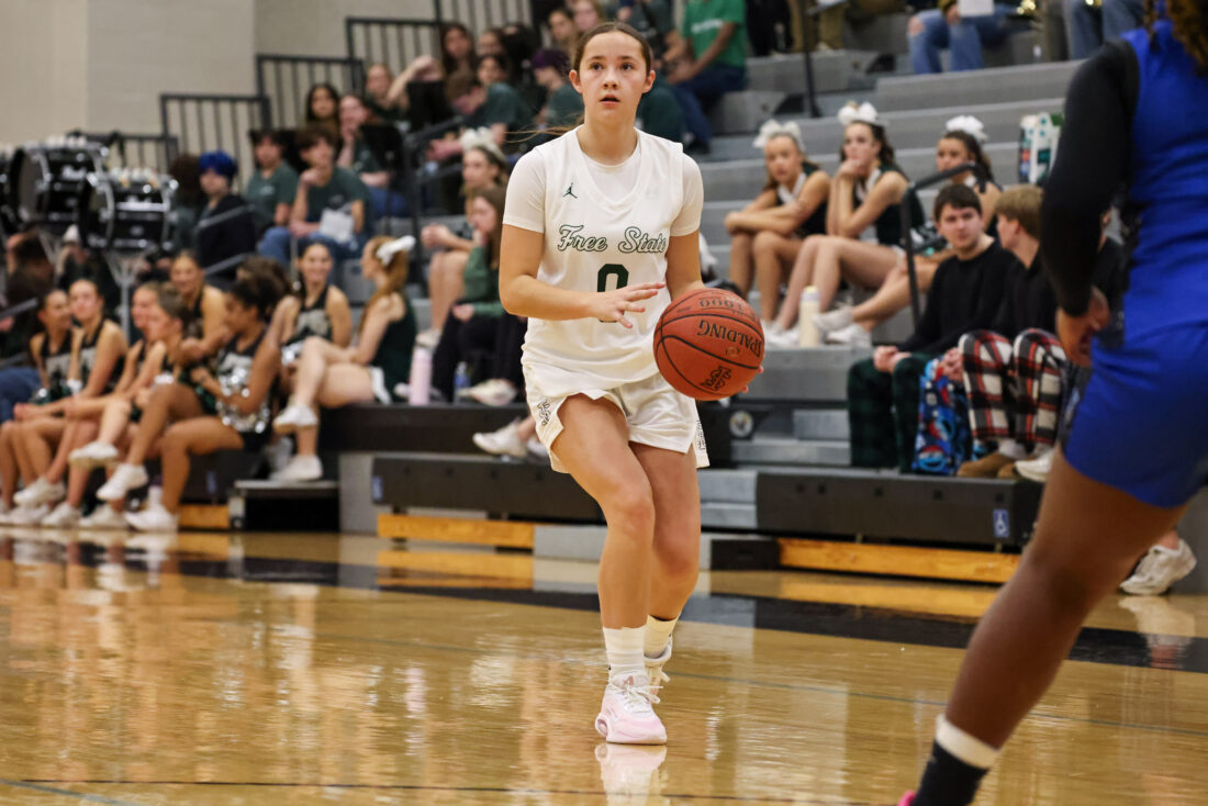 Free State freshman Morgan McClorey keeps her eye on the ball as it is brought down the court by Junction City on Tuesday, Dec. 2, 2025, at Free State High School in Lawrence.