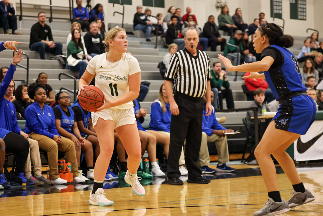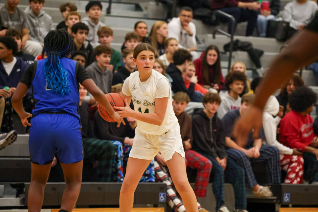 Free State freshman Quinlynn Vail looks for an open teammate during the Firebirds’ game against Junction City on Tuesday, Dec. 2, 2025, at Free State High School in Lawrence.