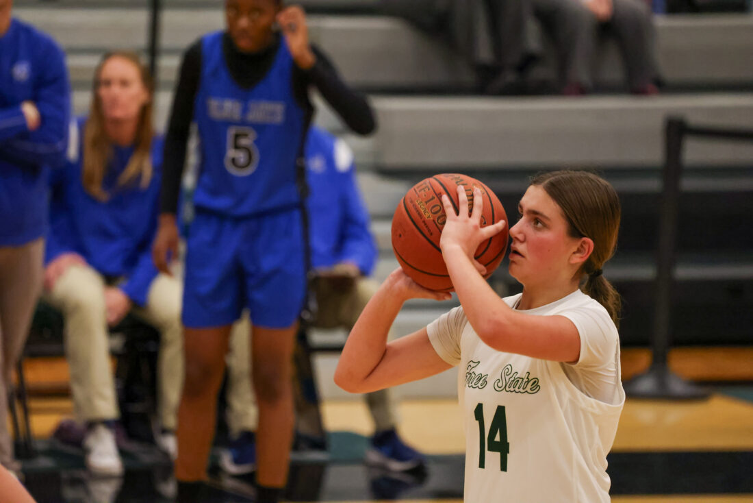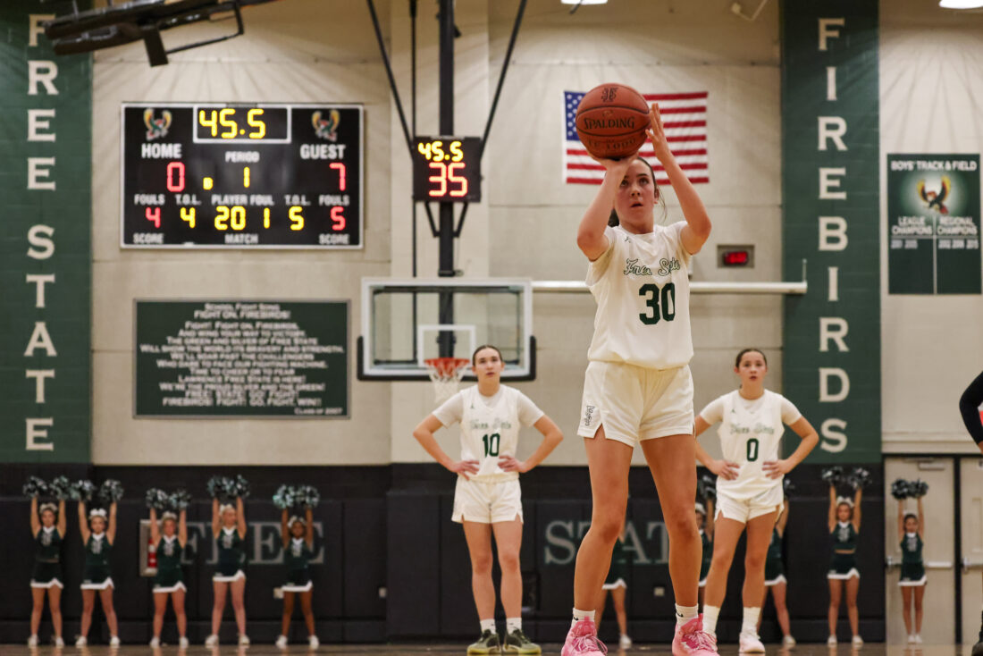 Free State freshman Quinlynn Vail takes a free throw during the Firebirds’ game against Junction City on Tuesday, Dec. 2, 2025, at Free State High School in Lawrence.