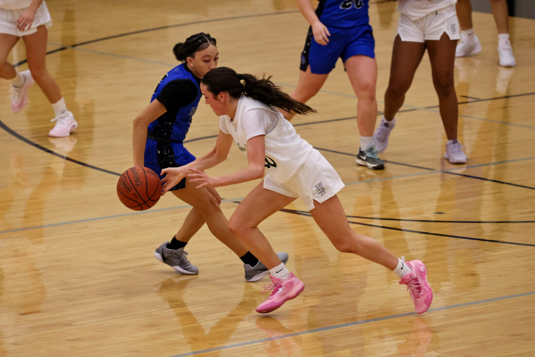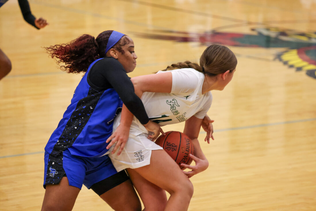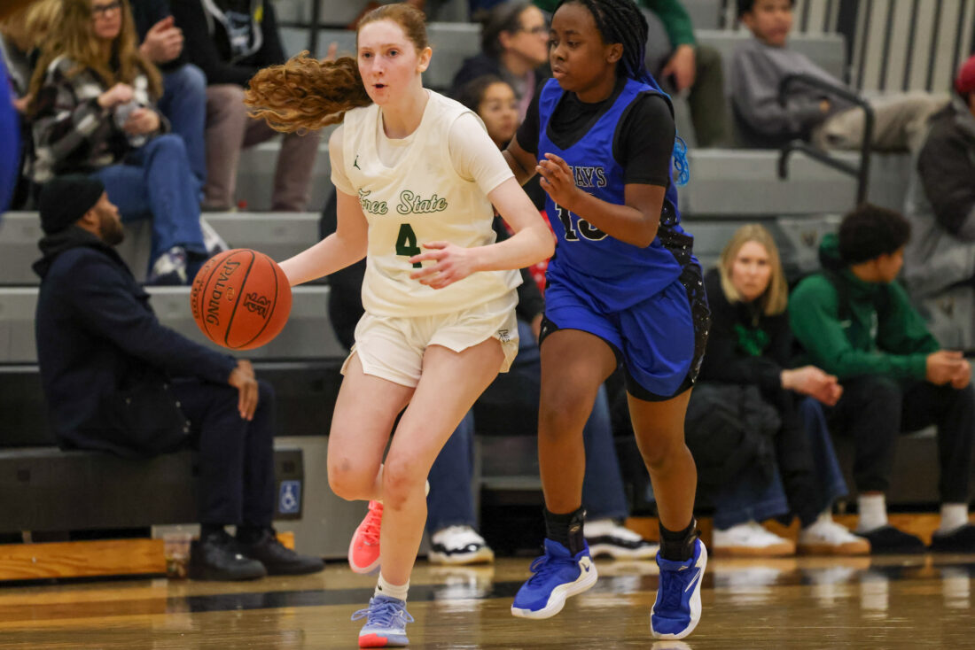 Free State junior Aedri Grooms keeps the ball away from a Junction City defender during the Firebirds’ game on Tuesday, Dec. 2, 2025, at Free State High School in Lawrence.