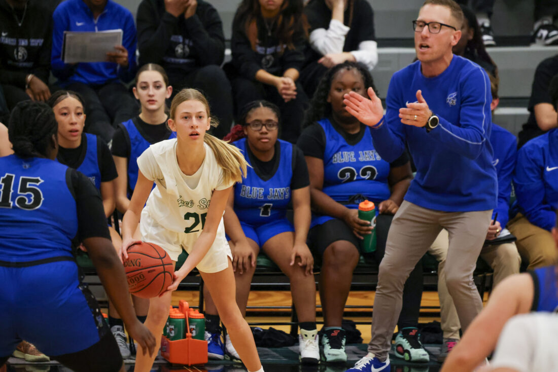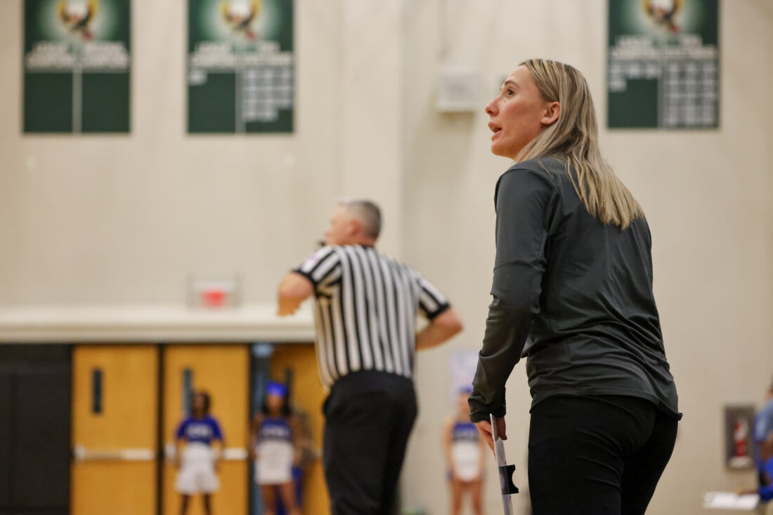 Free State girls basketball head coach Summer Frantz watches as a shot travels towards the basket during the Firebirds’ game against Junction City on Tuesday, Dec. 2, 2025, at Free State High School in Lawrence.