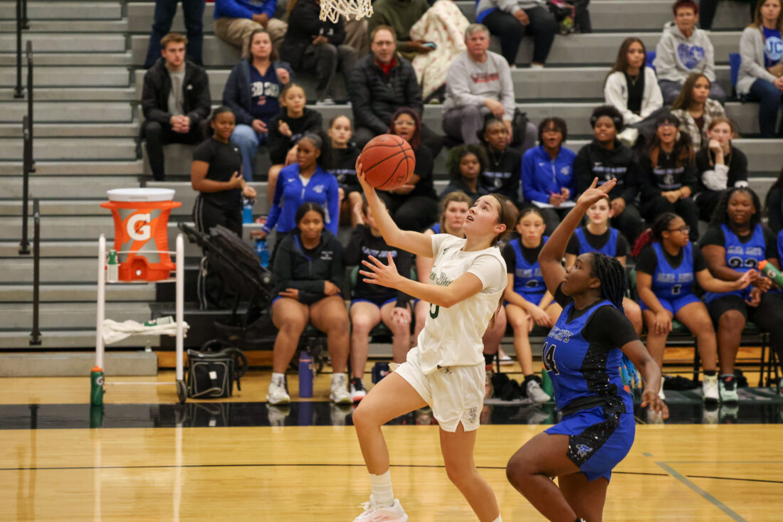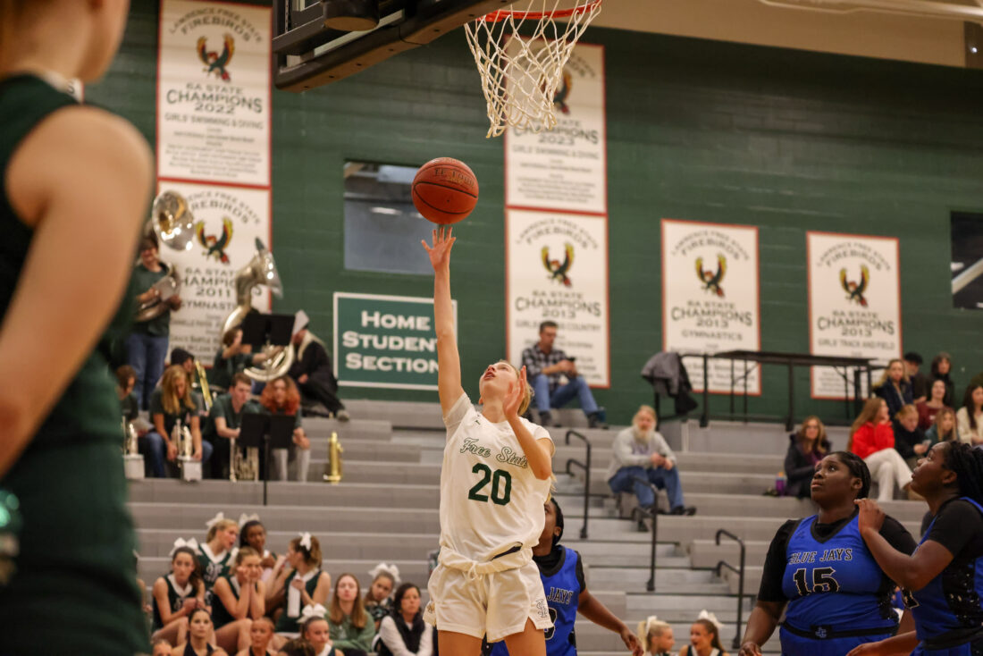 Free State senior Addie Fulscher finishes a fast break with a layup during the Firebirds’ game against Junction City on Tuesday, Dec. 2, 2025, at Free State High School in Lawrence.