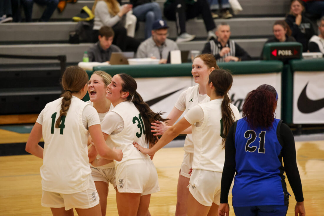 The Firebirds celebrate a play from freshman Morgan McClorey (center) during their game against Junction City on Tuesday, Dec. 2, 2025, at Free State High School in Lawrence.