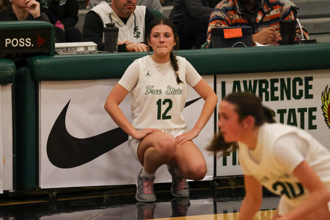 Free State sophomore Addi Hothan watches her teammates as she waits to check into the Firebirds’ game against Junction City on Tuesday, Dec. 2, 2025, at Free State High School in Lawrence.