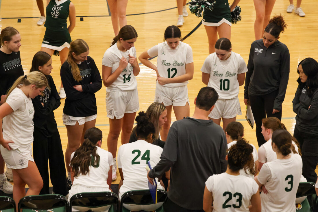 The Free State girls basketball team huddles around head coach Summer Frantz during their game against Junction City on Tuesday, Dec. 2, 2025, at Free State High School in Lawrence.