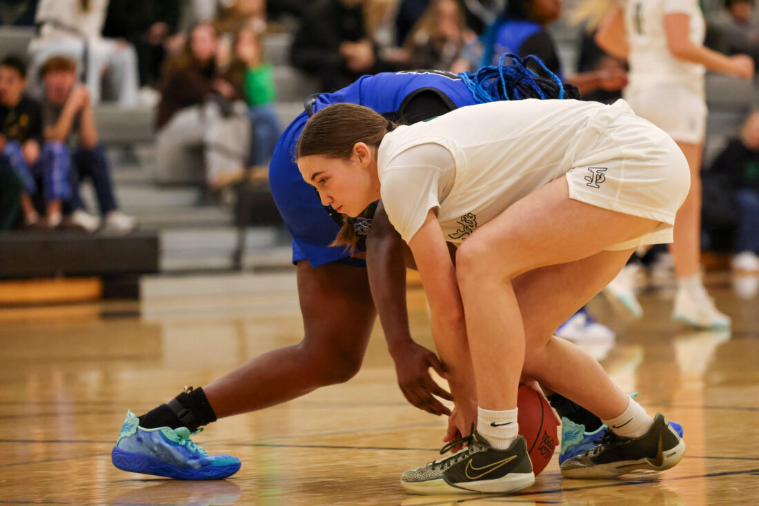 Free State junior Mallary Hice fights for a loose ball during the Firebirds’ game against Junction City on Tuesday, Dec. 2, 2025, at Free State High School in Lawrence.