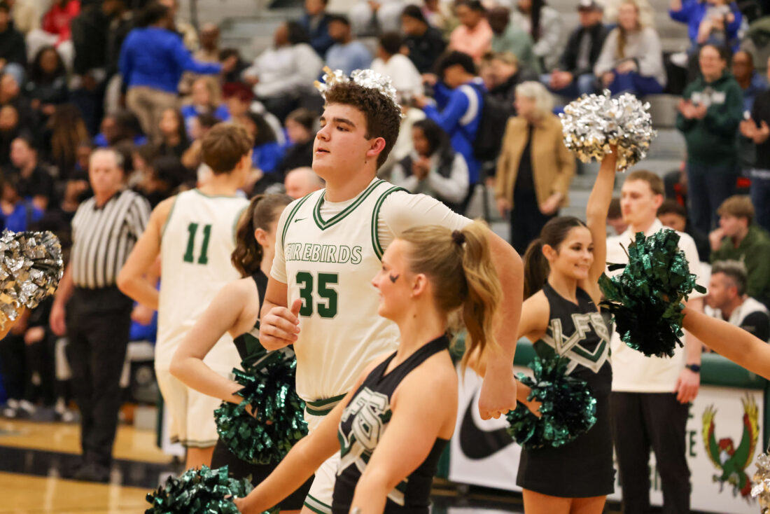 Free State sophomore Reece Wilmes comes on to the court as his name is announced prior to the Firebirds’ game against Junction City on Tuesday, Dec. 2, 2025, at Free State High School in Lawrence.