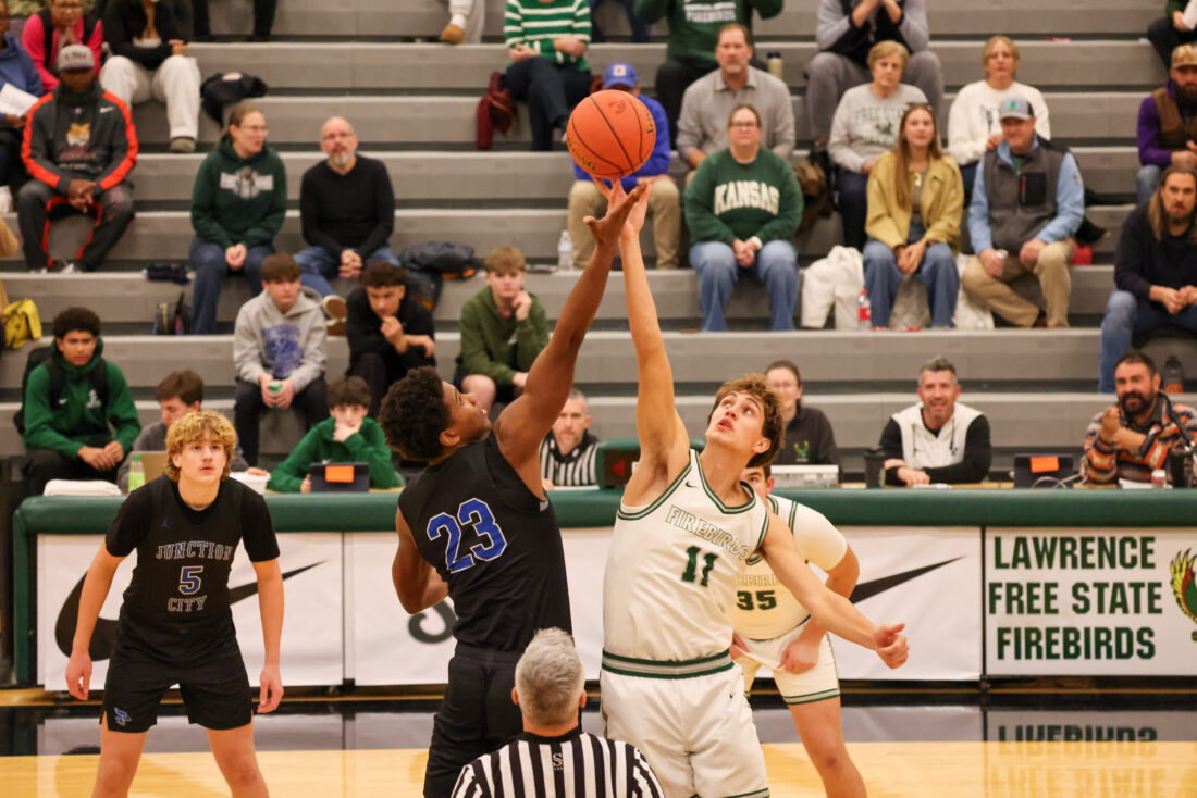 Free State senior Bennett Nagel goes up for the tip off to start the Firebird’s game against Junction City on Tuesday, Dec. 2, 2025, at Free State High School in Lawrence.