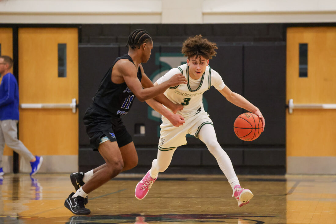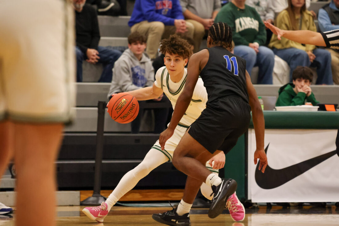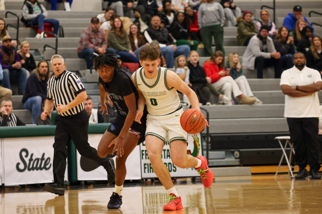 Free State sophomore Brenden Barrett brings the ball past half court during the Firebirds’ game against Junction City on Tuesday, Dec. 2, 2025, at Free State High School in Lawrence.