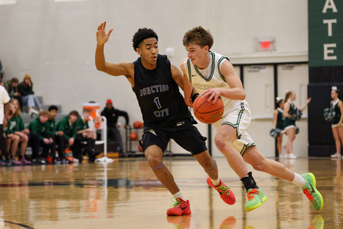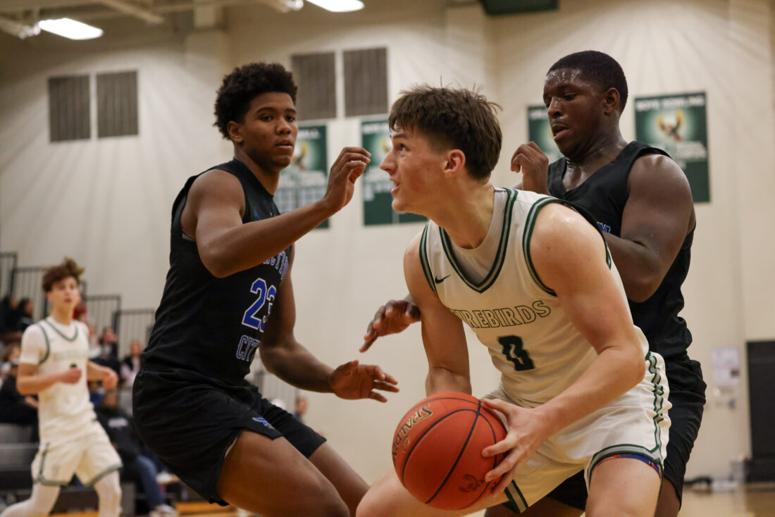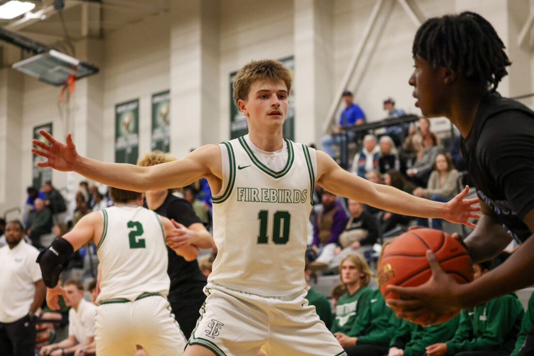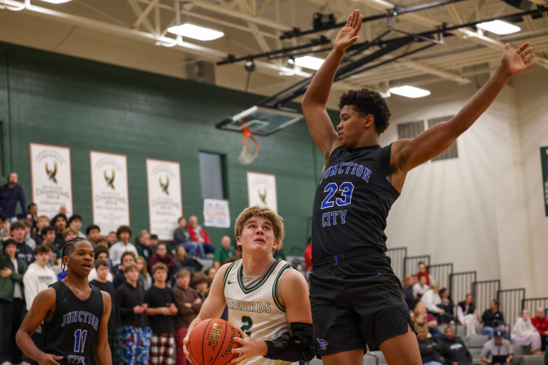 Free State senior Jadon Clock defends a Junction City inbound pass during the Firebirds’ game on Tuesday, Dec. 2, 2025, at Free State High School in Lawrence.