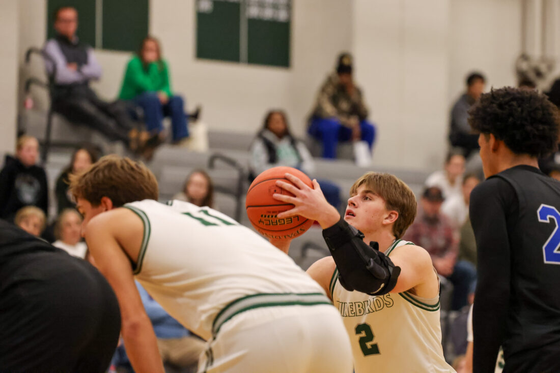 Free State sophomore Reece Wilmes eyes the basket before taking free throws during the Firebirds’ game against Junction City on Tuesday, Dec. 2, 2025, at Free State High School in Lawrence.