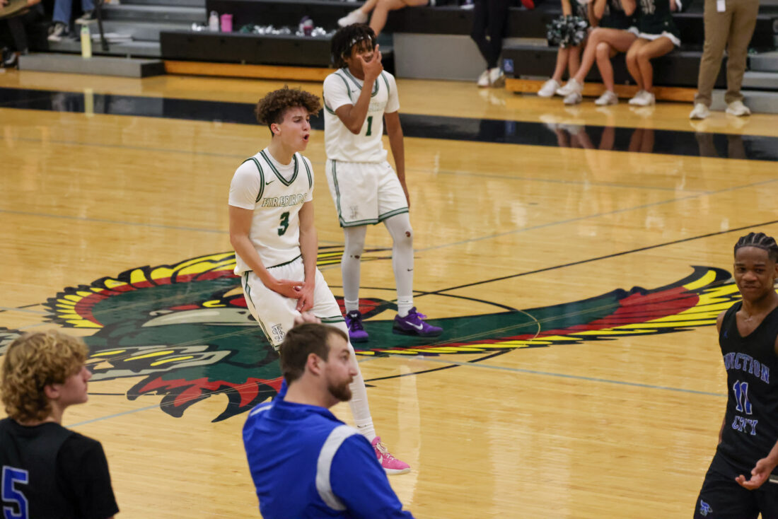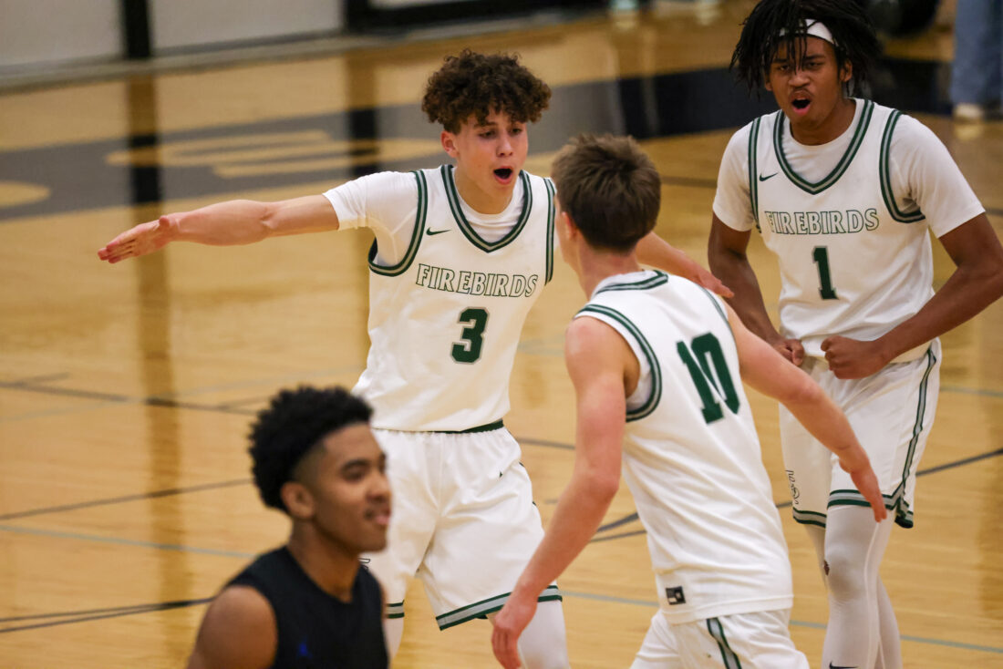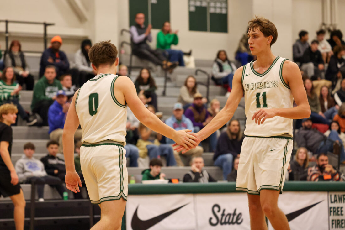 Free State sophomore Brenden Barrett (3) goes to high-five teammate Jadon Clock during the Firebirds' game against Junction City on Tuesday, Dec. 2, 2025, at Free State High School in Lawrence.