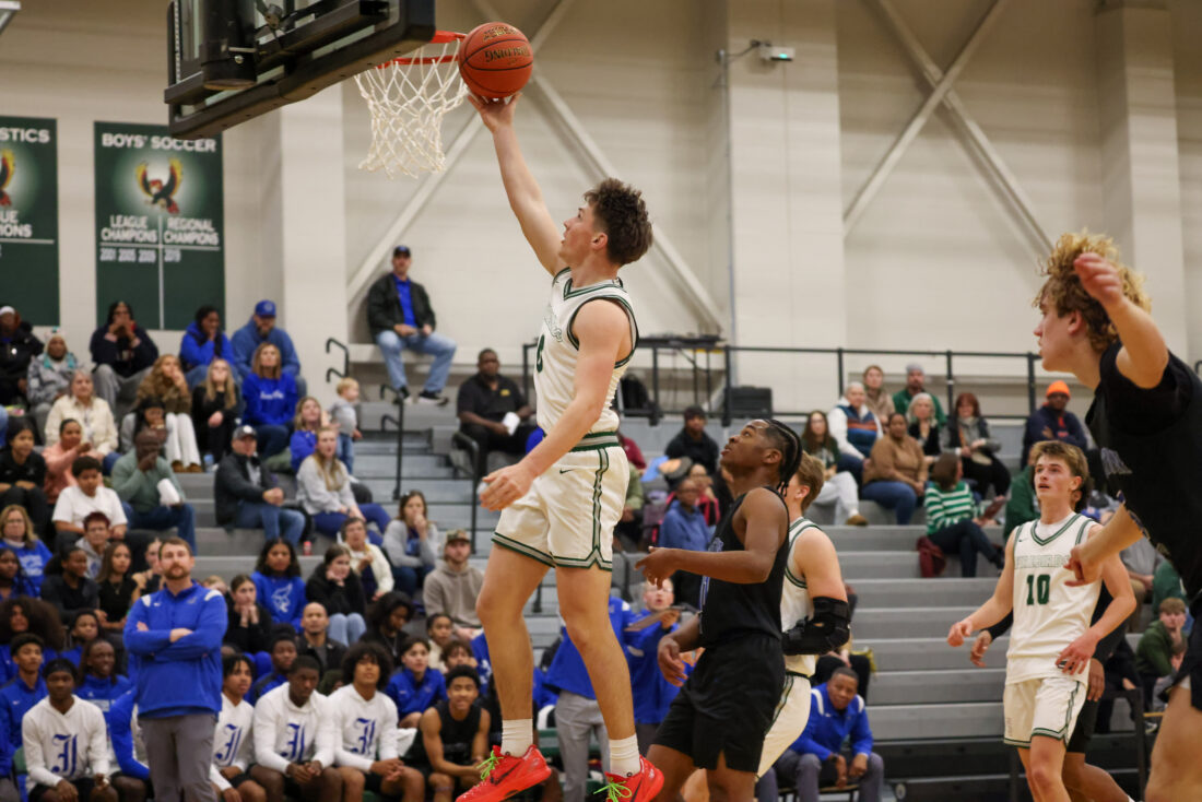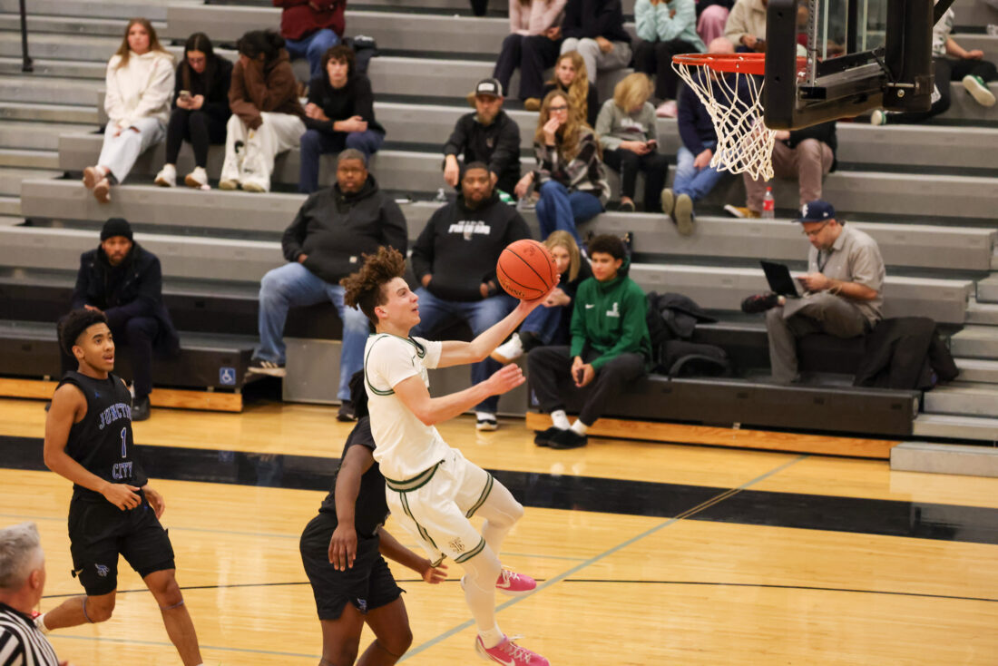Free State senior Bennett Nagel rises above the Junction City defense for a bucket during the Firebirds’ game on Tuesday, Dec. 2, 2025, at Free State High School in Lawrence.