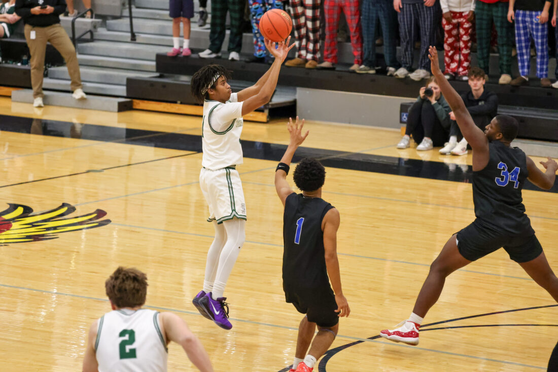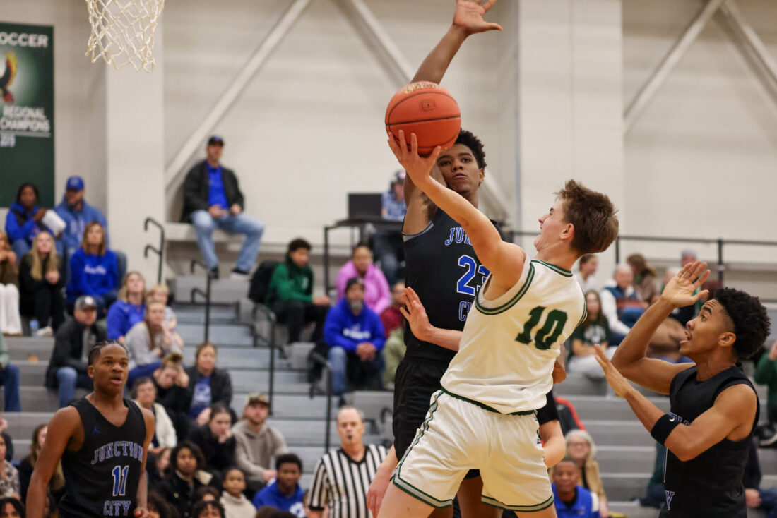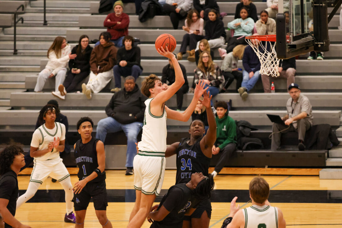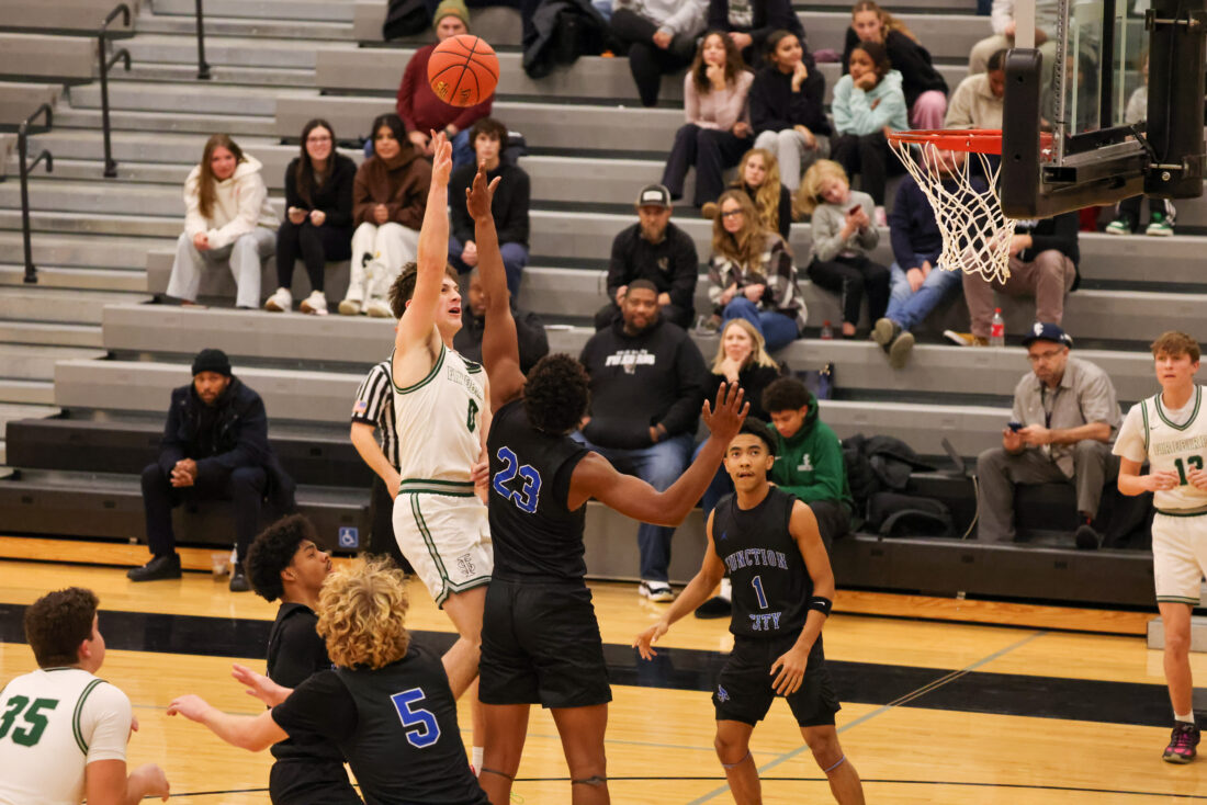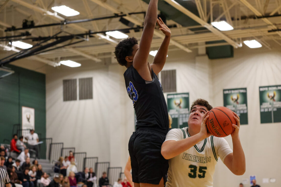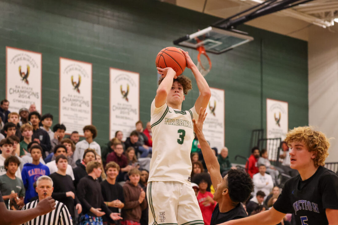 Free State junior Owen Garber shoots a 3 before being met by a Junction City defender during the Firebirds’ game on Tuesday, Dec. 2, 2025, at Free State High School in Lawrence.