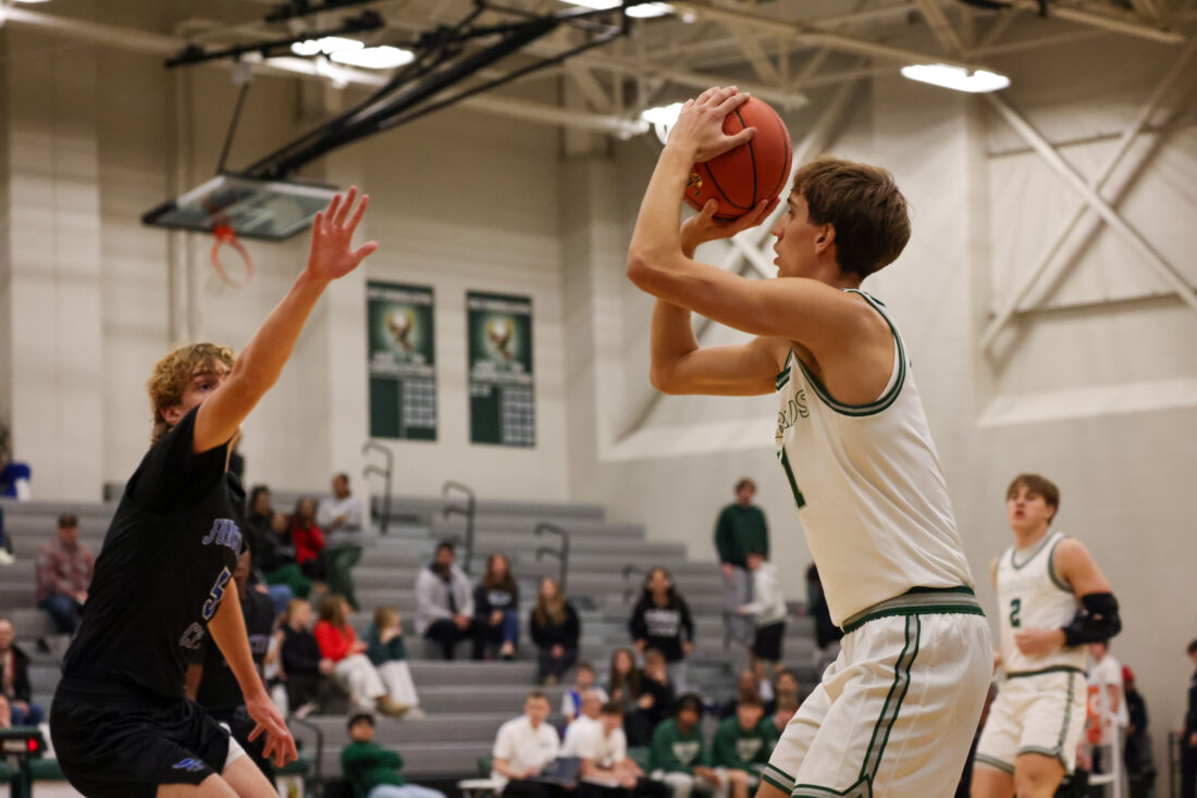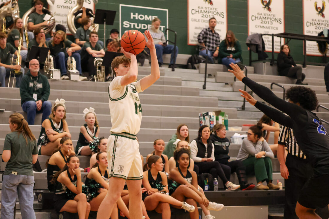 Free State senior Bennett Nagel keeps his eyes on the basket as he shoots a 3 during the Firebirds’ game against Junction City on Tuesday, Dec. 2, 2025, at Free State High School in Lawrence.