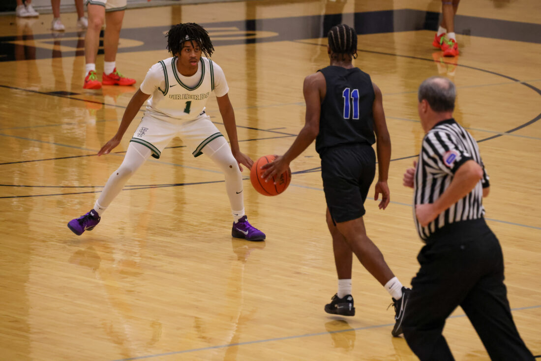 Free State sophomore Jayden Williams gets into his defensive stance as Junction City brings the ball down the court during the Firebirds’ game on Tuesday, Dec. 2, 2025, at Free State High School in Lawrence.