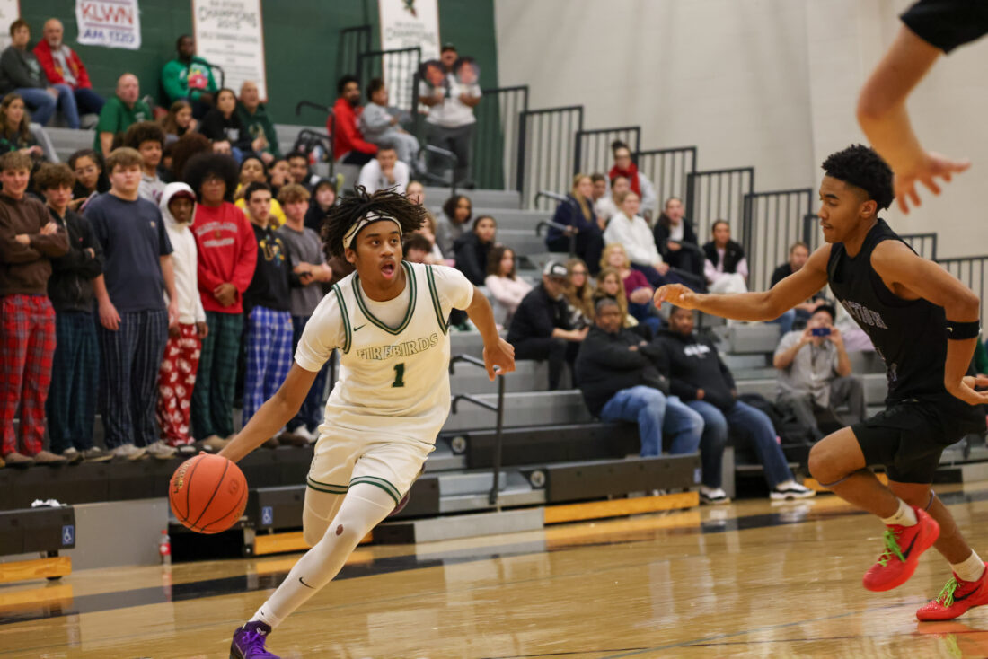 Free State sophomore Jayden Williams drives to the lane during the Firebirds’ game against Junction City on Tuesday, Dec. 2, 2025, at Free State High School in Lawrence.