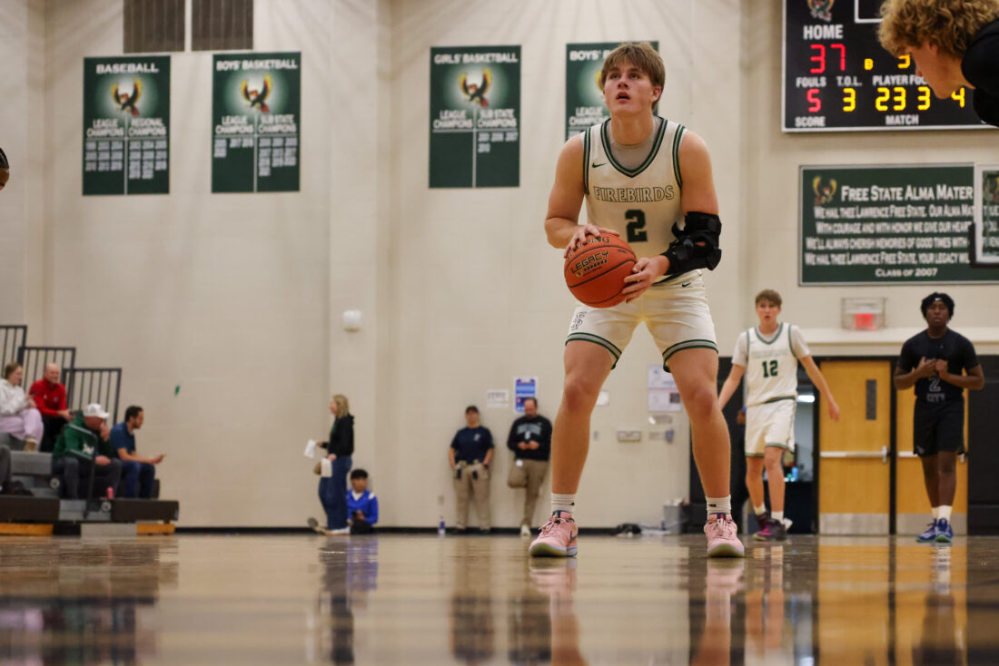 Free State senior Ethan Prescott shoots a free throw during the Firebird’s game against Junction City on Tuesday, Dec. 2, 2025, at Free State High School in Lawrence.