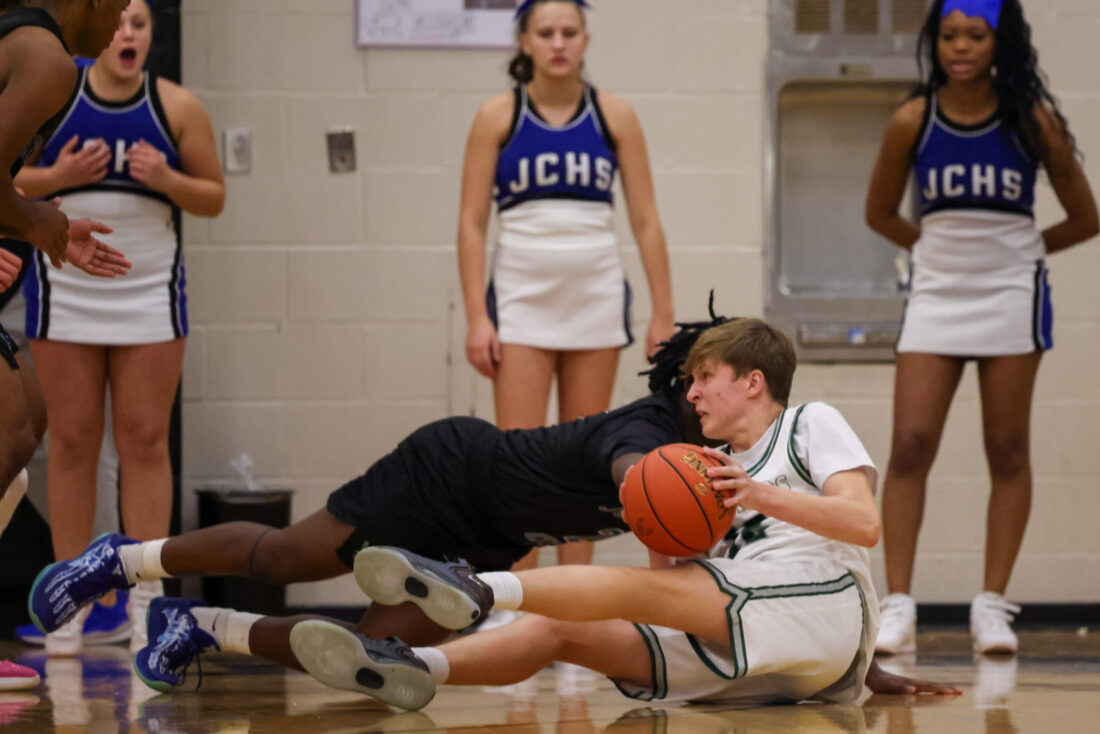 Free State freshman Packson McDaniel fights for a loose ball during the Firebird’s game against Junction City on Tuesday, Dec. 2, 2025, at Free State High School in Lawrence.