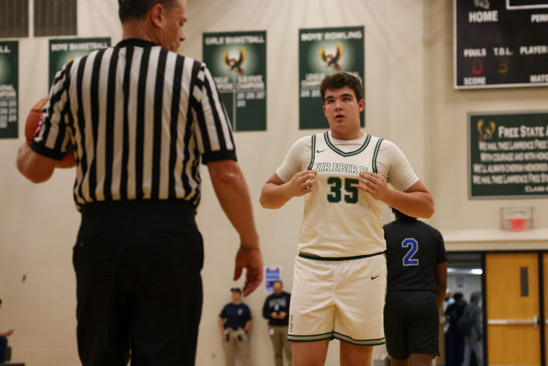 Free State senior Ethan Prescott goes through his free throw routine during the Firebirds’ game against Junction City on Tuesday, Dec. 2, 2025, at Free State High School in Lawrence.