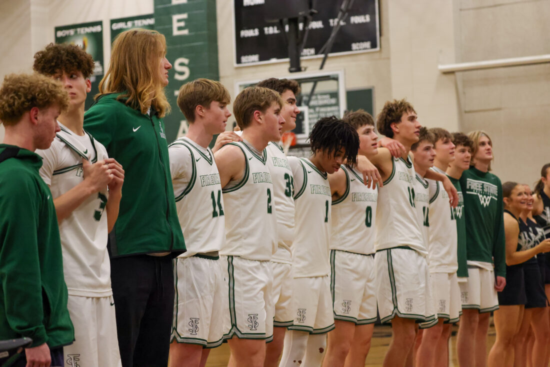 The Free State boys basketball team sings their school’s alma mater following their game against Junction City on Tuesday, Dec. 2, 2025, at Free State High School in Lawrence.