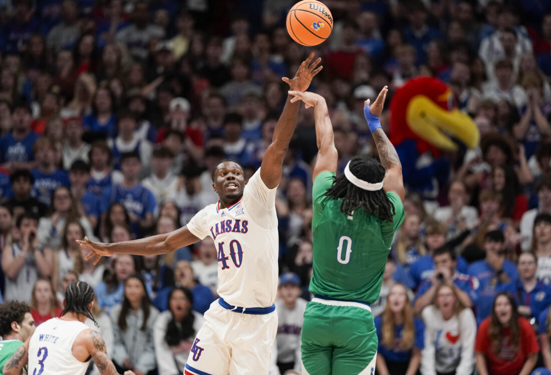 Kansas forward Flory Bidunga (40) tips a shot from Texas A&M-Corpus Christi guard Da Houston (0) during the first half on Tuesday, Nov. 11, 2025 at Allen Fieldhouse. Photo by Nick Krug