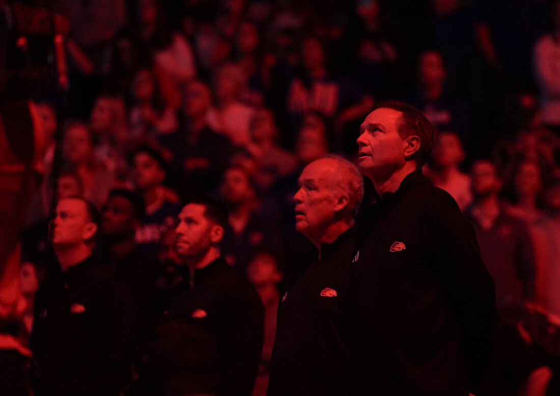 Kansas head coach Bill Self and his staff watch the video introduction prior to tipoff against Texas A&M-Corpus Christi on Tuesday, Nov. 11, 2025 at Allen Fieldhouse. Photo by Nick Krug