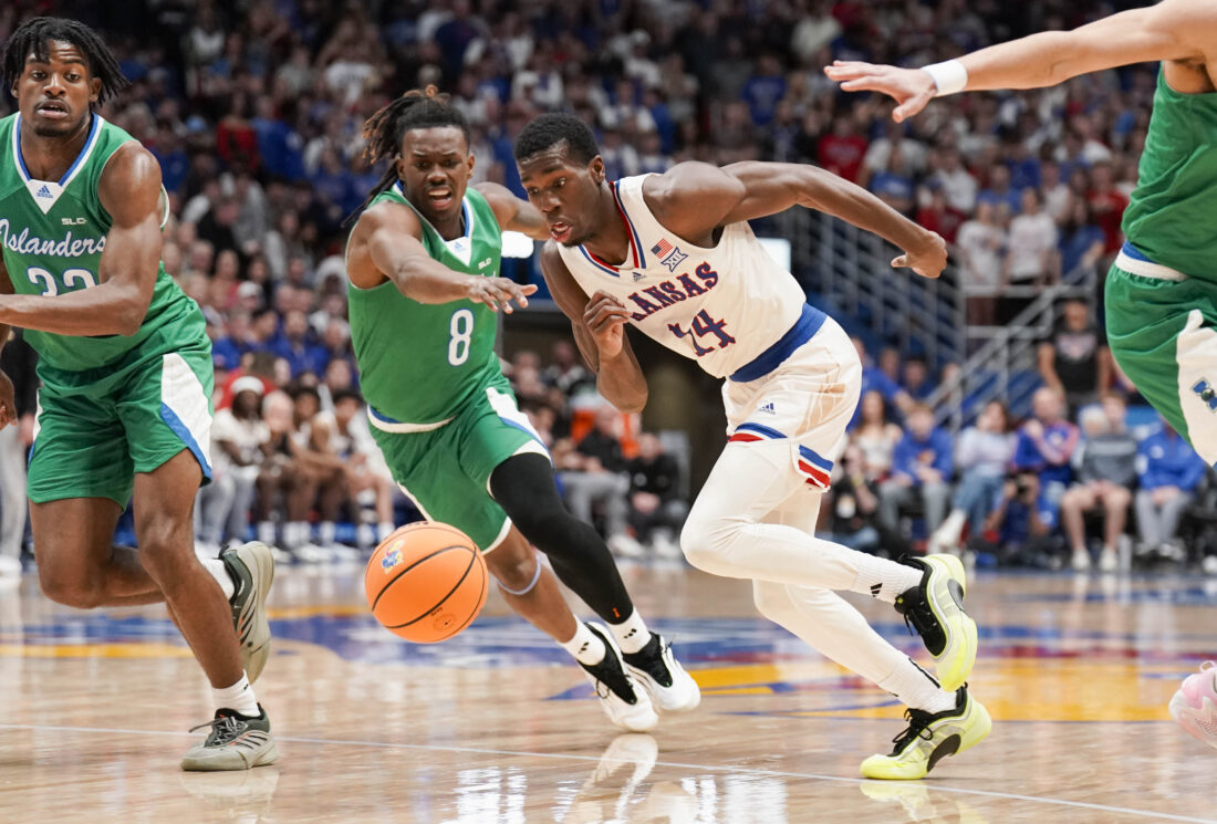 Kansas guard Melvin Council Jr. (14) chases a ball with Texas A&M-Corpus Christi guard Bryson Wheatfall (8) and Texas A&M-Corpus Christi forward Franck Yetna (22) during the first half on Tuesday, Nov. 11, 2025 at Allen Fieldhouse. Photo by Nick Krug