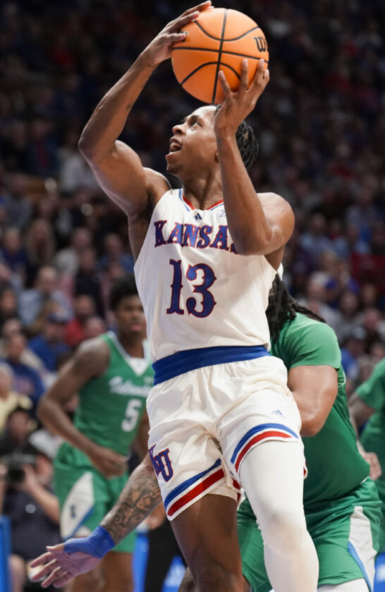 Kansas guard Elmarko Jackson (13) elevates to the bucket against Texas A&M-Corpus Christi during the first half on Tuesday, Nov. 11, 2025 at Allen Fieldhouse. Photo by Nick Krug