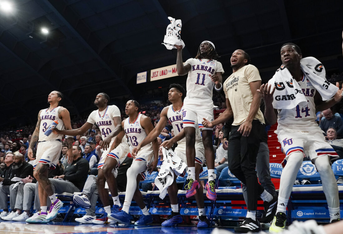 The Kansas bench gets excited after a dunk by Kansas forward Samis Calderon (6) during the second half on Tuesday, Nov. 11, 2025 at Allen Fieldhouse. Photo by Nick Krug